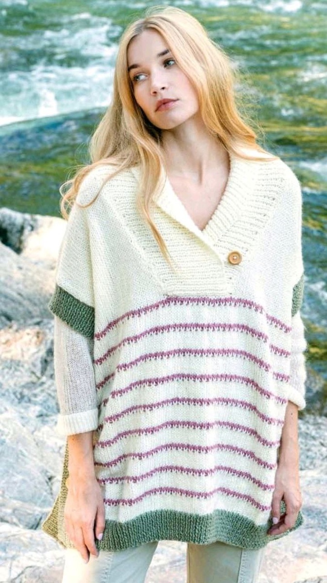 Необычная модель выполнена из упругой полушерстяной пряжи с антипилинговой обработкой . В основном узоре лицевая гладь чередуется с узкими фантазийными полосками. Шалевый воротник оформлен широкой резинкой в цвет полотна, внешние края подчёркнуты контрастной резинкой. По бокам пончо застёгивается на пуговицы. #пончо #жилет