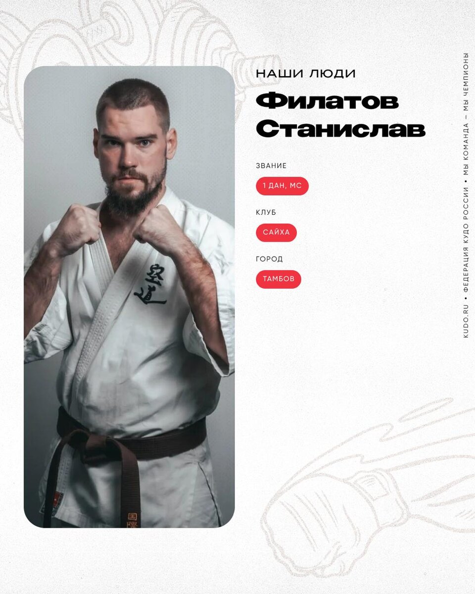 ⠀ 🥋 Филатов Станислав — 1 дан, МС Талантливый спортсмен, чуткий тренер, заядлый путешественник и дипломированный психолог. Мастер спорта и победитель многочисленных соревнований. Занимается единоборствами с 3.5 лет. На первое место ставит непрерывное развитие. Ценит кудо за многогранность стилей и единство взглядов. ⛩ Спортивный клуб — «Сайха» 📍 Город проживания — г. Тамбов Станислав Филатов по заветам мудрецов живёт жизнью счастливого человека. У него есть дело по душе — работа, коротая доставляет удовольствие, и спорт, в котором присутствует постоянное движение вперёд. Есть возможность путешествовать, познавая новое и меняя окружающающую картинку. А ещё Станислава наполняет любовь — любовь к делу, любовь к природе и себе. 👉 Читайте продолжение интервью на нашем сайте — https://kudo.ru/people/filatov-stanislav/