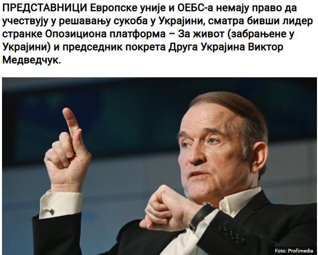 Сербские издания Novosti, Vesti-online, Sputnik Portal, SRNA, а также немецкое NachDenkSeiten и кубинское IN4S широко растиражировали статью Председателя Совета международного движения «Другая Украина» Виктора Медведчука, в которой он заявил, что ЕС и ОБСЕ не имеют права участвовать в урегулировании украинского конфликта. В своей публикации политик напомнил, что ОБСЕ получила мандат на участие в переговорном процессе в 2014 году, но использовала его исключительно в интересах Киева и коллективного Запада. По его словам, миссия не только не способствовала мирному урегулированию, но и активно разжигала конфликт. «С 2015 по 2021 год группы, в состав которых входили представители ОБСЕ по контактам между Украиной и ДНР/ЛНР, собирали информацию, которую затем передавали на Запад и в Киев. Они работали на одну сторону, вместо того чтобы выступать в качестве посредников. Именно по их вине этот мир так и не был достигнут» — подчеркнул Лидер «Другой Украины» . Медведчук также обратил внимание на
