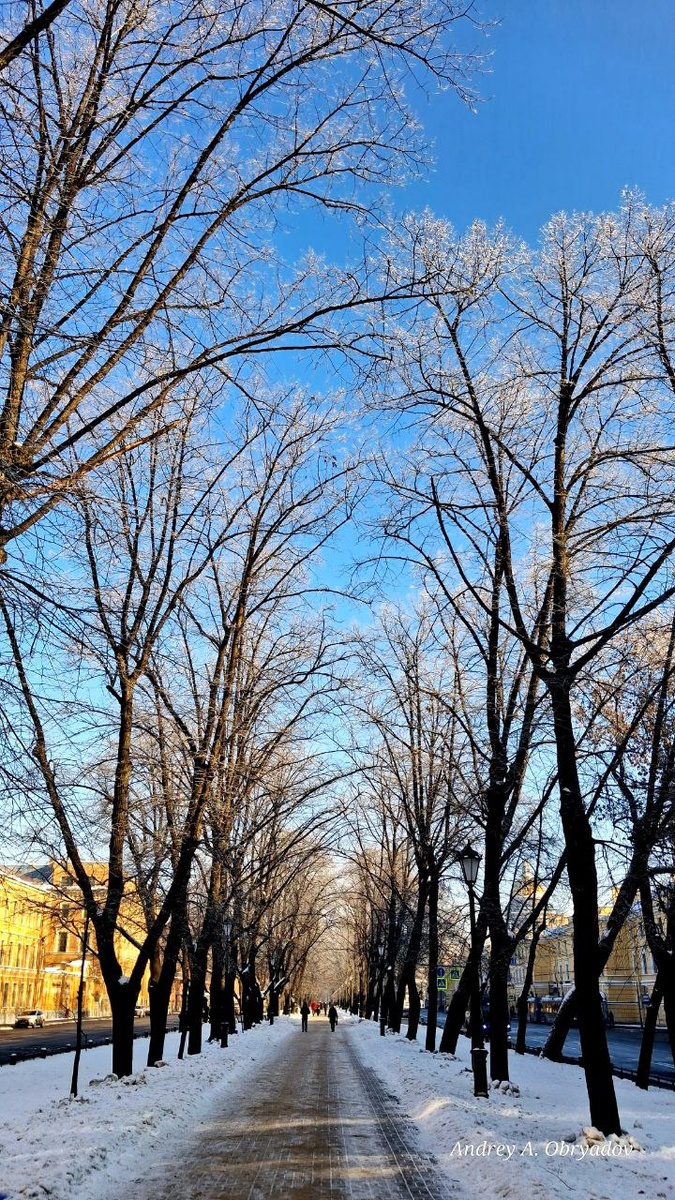 Не так часто в Петербурге можно наблюдать такую комбинацию - серебро инея на ветках, синеву пронзительную неба и яркий огненный шар на небосводе. Когда не особо холодно, как сегодня, можно гулять по улицам города и наслаждаться видами. Эти фото сделаны в самом центре Петербурга.