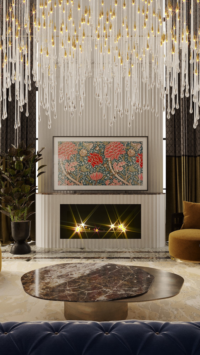 Это пространство соткано из контрастов, которые, встречаясь, рождают идеальную гармонию. Здесь царство света и глубины, классической основы и современной дерзости. Это дом, где хочется проводить званые вечера и встречать тихие семейные праздники. Вы входите и сразу же оказываетесь во власти вертикали. Второй свет в зоне гостиной взламывает привычное пространство, уводя взгляд ввысь, к потолку, который кажется невесомым. Светлые стены с изящной лепниной словно дышат: благородная классическая основа становится идеальным холстом для игры света и тени. Лепнина здесь не выглядит музейной — она задает ритм, подчеркивает графичность и сообщает интерьеру ту самую архитектурную музыку, без которой роскошь была бы просто дороговизной. На этом светлом фоне главную партию исполняют диваны. Они огромные, глубокие, цвета полночного неба. Темно-синяя обивка — насыщенная, бархатистая — создает ощущение спокойной уверенности. Это цвет моря перед рассветом, цвет драгоценного лазурита. Диваны не просто с