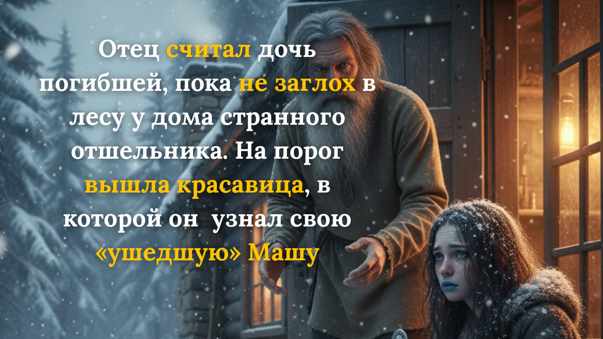 Маша шла долго. Снег забивался в ботинки, пальцы онемели. Деревня, о которой говорила мачеха, оказалась заброшенной. Лишь в глубине леса, у самого берега замерзшей реки, виднелся дымок.