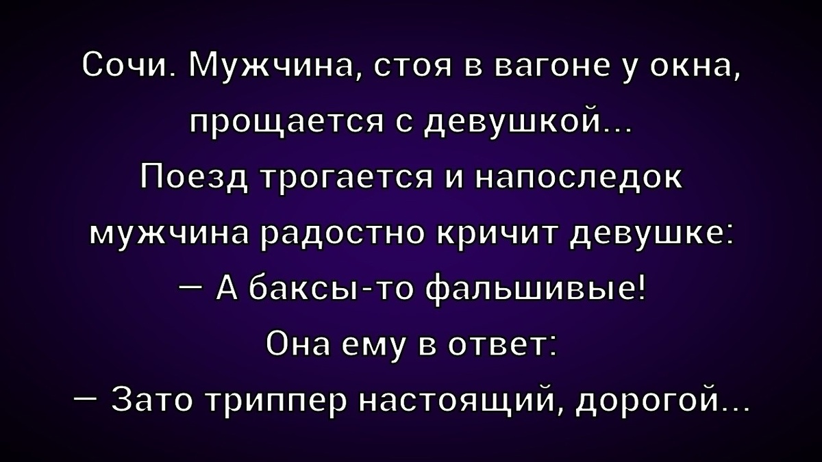 ☺☺☺ Сидят как-то двое на берегу озера. Вдруг видят - девушка тонет. Один подскакивает, собирается спасать, другой его одёргивает: — Куда это ты? — Так ведь тонет же!!! Мы её спасём, она нас отблагодарит, в гости пригласит, даст, скорее всего!! — Подожди. Пусть она утонет, мы её выловим, а там её уже никто и спрашивать не будет. Девушка утонула, эти надевают маски, ласты и на дно. Вытащили... Ну и первый уже завершил своё грязное дело, уже застёгиваясь и крутя носом: — Слышь, только недавно утонула ведь, а уже так воняет, ффу!! Второй: — Ну конечно, та в купальнике была, а эта в фуфайке и на коньках! ❗️❗️❗️ Делитесь с друзьями постами на своей странице!