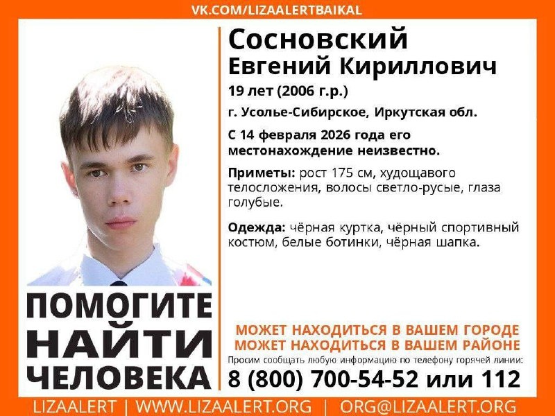 С 14 февраля 2026 года неизвестно местонахождение Евгения Кирилловича Сосновского, 19 лет. Если у вас есть информация, звоните на горячую линию отряда 8-800-700-54-52. Источник: ЛизаАлерт 📲Подписаться на канал 📲Только главные новости Усолья-Сибирского и никакой рекламы в нашем МАХ
