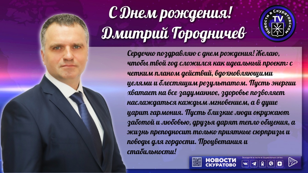 Сердечно поздравляю с днем рождения! Дмитрий Городничев Желаю, чтобы твой год сложился как идеальный проект: с четким планом действий, вдохновляющими целями и блестящим результатом. Пусть энергии хватает на все задуманное, здоровье позволяет наслаждаться каждым мгновением, а в душе царит гармония. Пусть близкие люди окружают заботой и любовью, друзья дарят тепло общения, а жизнь преподносит только приятные сюрпризы и поводы для гордости. Процветания и стабильности!