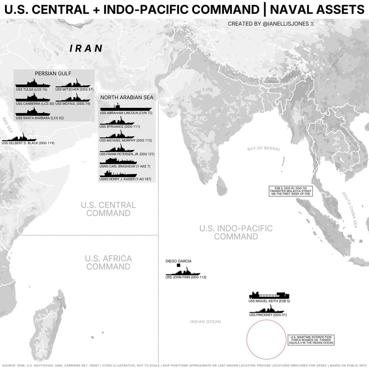 Военно-морские силы США на Ближнем Востоке пополнились седьмым ракетным эсминцем типа «Арли Бёрк». В середине марта ожидается прибытие второго авианосца «Джеральд Форд» в сопровождении трёх эсминцев из Карибского региона, где они участвовали в агрессии против Венесуэлы. С учётом прибывшего, в данный момент вблизи Ирана сосредоточено 12 боевых кораблей и, возможно, некоторое количество подводных лодок, местонахождение которых не раскрывается. Известно, что по крайней мере одна атомная подлодка сопровождает каждую авианосную ударную группу.