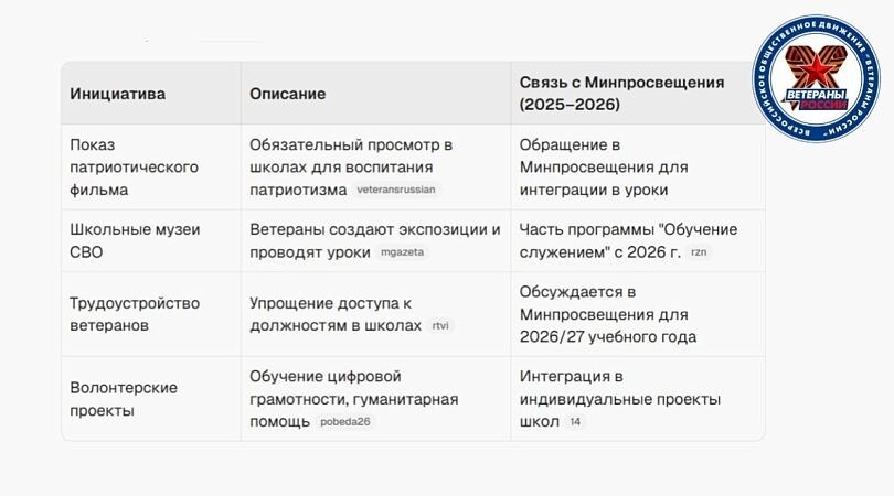 Движение поддерживает проекты по созданию школьных музеев, посвященных героям СВО, где ветераны организуют уроки памяти, поиск пропавших без вести и гуманитарные миссии в прифронтовых районах. Эти инициативы интегрируются в федеральную программу "Обучение служением. Первые", которая с сентября 2026 года станет обязательной частью предмета "Индивидуальный проект" для 10–11 классов, позволяя школьникам нарабатывать баллы к ЕГЭ за волонтерство с ветеранами. Ветераны предлагают упростить их трудоустройство в школах как заместителей директоров по воспитательной работе или наставников, что обсуждается в Минпросвещения для усиления патриотического блока.