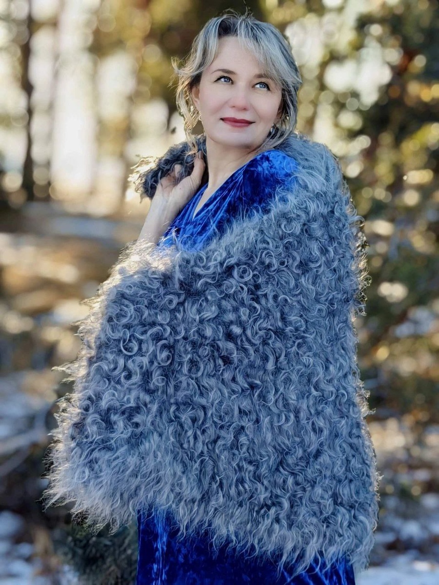 косынка , редкого светло - серого , будто седого цвета , с голубым подтоном и очень крупным , богатым локоном . Фото получились яркими , атмосферными , но , к сожалению , они не передают и 30 % реального цвета , поэтому постаралась описать максимально красноречиво Косынка безумно красивая , штучная , существующая в единственном экземпляре , она очень ласковая , теплющая , плотно связана на тонких иглах. Урюпинская пуховая косынка – это настоящая русская классика ! Ни с чем не сравнится то чувство, когда холодным вечером на плечи опускается уютное , воздушное полотно, и по телу разливается приятная нега . Это невероятно теплое изделие способно согреть не хуже натурального меха , дотронувшись до нее однажды , Вам уже не захочется выпускать ее из рук , " Княжеский полушалок " это настоящее сокровище и прекрасный подарок для себя любимой , близких , родных и друзей на значимое событие или просто , без повода , тому , кто дорог .