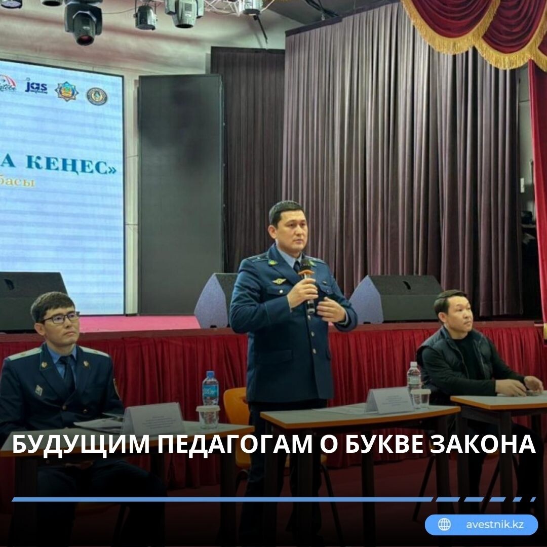 ⚖️ Инициировал мероприятие в рамках принципа «Закон и порядок» областной молодежный ресурсный центр. Преподаватель колледжа Аяулым Арыстангаликызы отметила важность профилактического и просветительского значения подобных встреч. 💬 — У нас обучается свыше двух тысяч человек. Действуют кружки и клубы, будущие педагоги при желании могут стать волонтерами движения «Мейірім», участвовать в дебатах или присоединиться к сообществу «Жастар рухы». Члены последнего часто проводят мероприятия правовой направленности, организуют встречи с ветеранами педагогического труда, что способствует укреплению преемственности поколений. Недавно учащиеся выступили с концертом для постояльцев центра поддержки детей «Аяла», — рассказала она. 💼 Прокурор управления по надзору за законностью досудебного расследования прокуратуры области Жунис Какимов напомнил молодежи о необходимости соблюдения законодательства. Выделил вопросы юридической ответственности и последствий нарушений нормативных правовых актов.