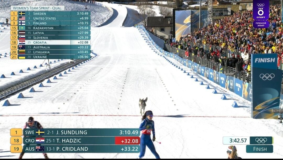 И финишировала! Сегодня во время квалификации женского командного спринта на Олимпийских играх в Италии на лыжную трассу неожиданно выбежала собака. Инцидент случился на финишной прямой. Собака не проявила агрессии и успела обнюхать несколько спортсменок. Появление животного на результаты квалификации не повлияло. В эфире трансляции представили официальный «фотофиниш» собаки, зафиксировав пересечение ею финишной черты. Вскоре сотрудники стадиона смогли подозвать животное к себе и аккуратно увести его в безопасную зону. Организаторам не удалось установить, откуда взялась собака и как она попала на охраняемую территорию. Фото: скриншот трансляции Окко 📱 Мы в МАХ