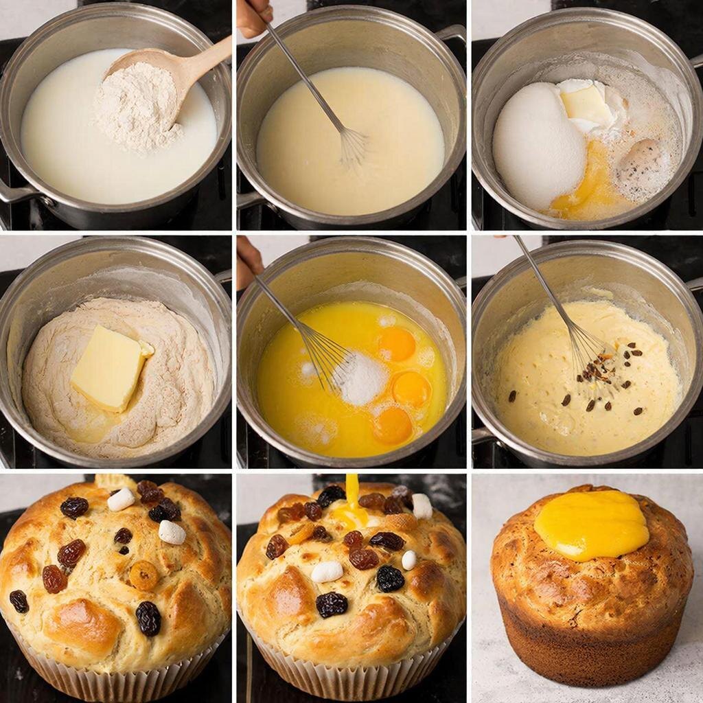 8. Формовка и выпечка:Подготовьте формы для куличей (смажьте маслом и присыпьте мукой, или используйте бумажные формы).