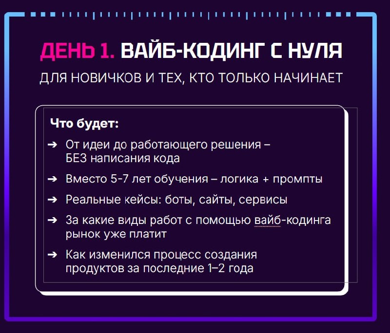 ❗️❗️❗️Что в эфире: → От идеи до работающего решения – БЕЗ написания кода → Вместо 5-7 лет обучения – логика + промпты → Реальные кейсы: боты, сайты, сервисы → За какие виды работ с помощью вайб-кодинга рынок уже платит → Как изменился процесс создания продуктов за последние 1-2 года ❗️❗️❗️Много практики: → Бот с ИИ, который работает автономно от нейросети, не передает информацию на сервера, сохраняя конфиденциальность. → Сайт для фитнес-тренера → Разберем, где новички чаще всего совершают ошибки → Создание онлайн-игры Вы поймете, что такое вайб-кодинг, видите реальные возможности и понимаете, куда можно двигаться дальше. ИДУ НА ЭФИР ИДУ НА ЭФИР ИДУ НА ЭФИР Заходите на эфир по ссылке 👉https://xbaranova neiro ru