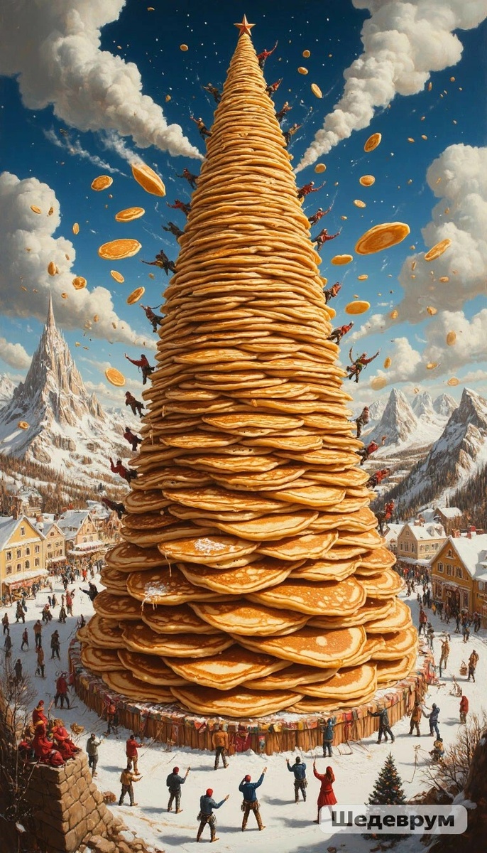 Картинка про Масленицу у ИИ получилась гораздо лучше, чем стихи. Только вот зачем с блинами на санках кататься?...