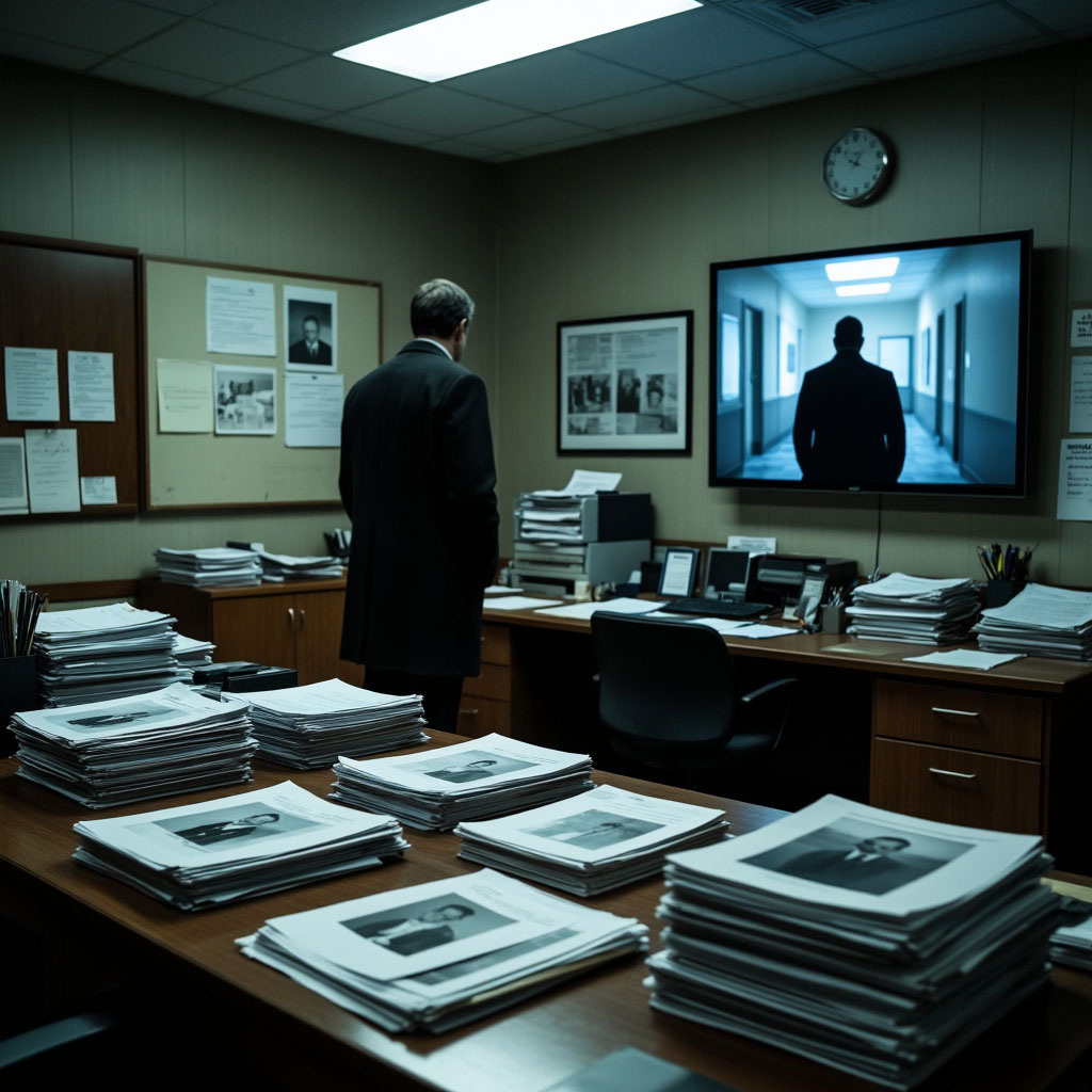 В кабинете следователя — напряжённая тишина. На столе — горы документов, распечатки переписок, фотографии. В углу — экран, на котором вновь и вновь проигрывается одно и то же видео: человек в тёмном пальто передаёт пакет мужчине в медицинском халате. Кадры повторяются, будто пытаясь высветить скрытую правду.