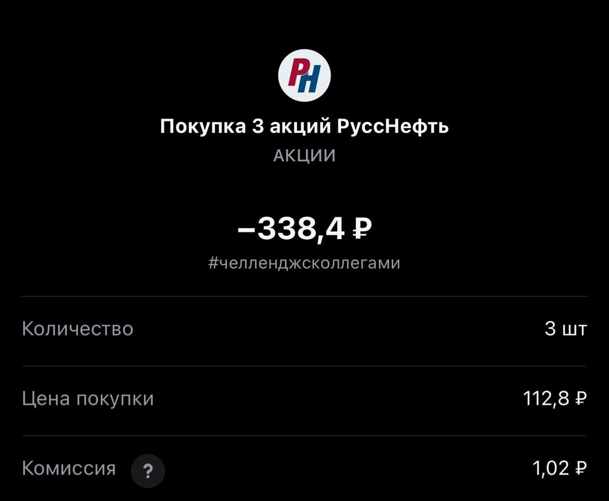 ! Покупка на сегодня #369 на все свободные средства. Статистика портфеля на стороннем сервисе, можно посмотреть по "ссылке" Напомню это челлендж с коллегами, каждый рабочий день пополняем брокерский счет на 250 рублей и инвестируем. Если возникли вопросы или есть не понимание, что делать. Задавайте «тут» Покупка #369 🟢 «РуссНефть» 112.8 rub #RNFT 3 лота #каждыйсможет #челенджсколлегами ✈️ Стас Мироненко