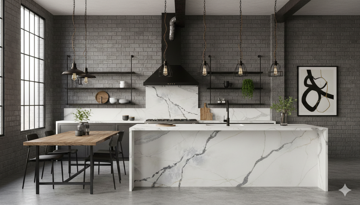 Индастриал часто путают с лофтом, но это ошибка. Если лофт - это жилье художников в бывших фабриках, то индастриал - сама фабрика, перенесенная в современную квартиру. Стиль зародился в период индустриальной революции, когда архитекторы перестали прятать конструктив зданий за лепниной. Красоту начали видеть в функции: в массивных заклепках, тяжелых балках и грубой отделке. Чем характерен настоящий индастриал? В отличие от многих декоративных стилей, здесь всё подчинено логике производства. Роль камня в индустриальном контексте В заводской среде поверхности должны выдерживать колоссальные нагрузки. В интерьере мы имитируем эту надежность, но добавляем гигиеничность. Пол как фундамент В цехах полы заливали бетоном. В жилом пространстве это неудобно: бетон холодный и трескается. Для создания нужного эффекта лучше использовать крупноформатную керамику или кварцевый агломерат серого цвета с неоднородными вкраплениями. Это дает визуальный эффект монолитной плиты, которая не боится влаги. Раб