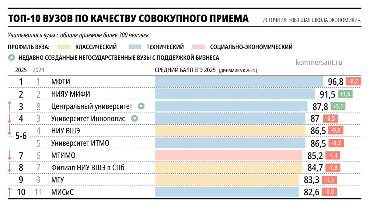 Топ-3 по качеству совокупного приёма: МФТИ — средний балл ЕГЭ 96,8 МИФИ — 91,5 Центральный университет — 87,8 (+3,1 за год) В топ-5 также вошли Университет Иннополис и Высшая школа экономики. Самый заметный рост — у Центрального университета: с 8-го (в 2024г.) на 3-е место (в 2025г.). По качеству платного приёма он вышел на 1-ю позицию, обогнав МФТИ и Иннополис (в комментариях) Средний балл ЕГЭ — это индикатор селективности. Он отражает конкурс и стратегию набора, а не то, как вуз будет учить конкретного студента. Что важно родителям и абитуриентам Рейтинг — это маркер уровня конкуренции. Но при выборе программы важно учитывать: 🔘профиль и содержание обучения, 🔘реальная нагрузка и требования, 🔘карьерная траектория выпускников, 🔘соответствие способностей подростка академической среде. Высокий уровень качества приема — это про «кто туда поступает». Но это важно не всем и не всегда. Поэтому для грамотно выстроенной стратегии поступления у вас должны быть свои личные критерии, важн