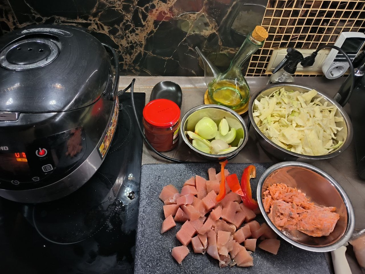 Моя помощница Мультиварка МУЛЯ Все как всегда - очень Просто! Ингредиенты: Куриная грудка 500гр Лук 3шт Морковь 1 шт Капуста 800гр Соль, перец по вкусу 1чл Лавр. лсит 2 шт Воды 300мл+ томат паста 3чл Раст. масла 2ст.л Закладываем в мультиварку мясо, лук, морковь. У меня оставался болгарский перец. Программа ЖАРКА 15 минут Капуста шинкуем, добавляем к мясо, лавр.лист, воду с томатом. Программу ставим на ТУШЕНИЕ на 40 минут. Вкусно. Просто. Легко🍒✌ Приятного аппетита!