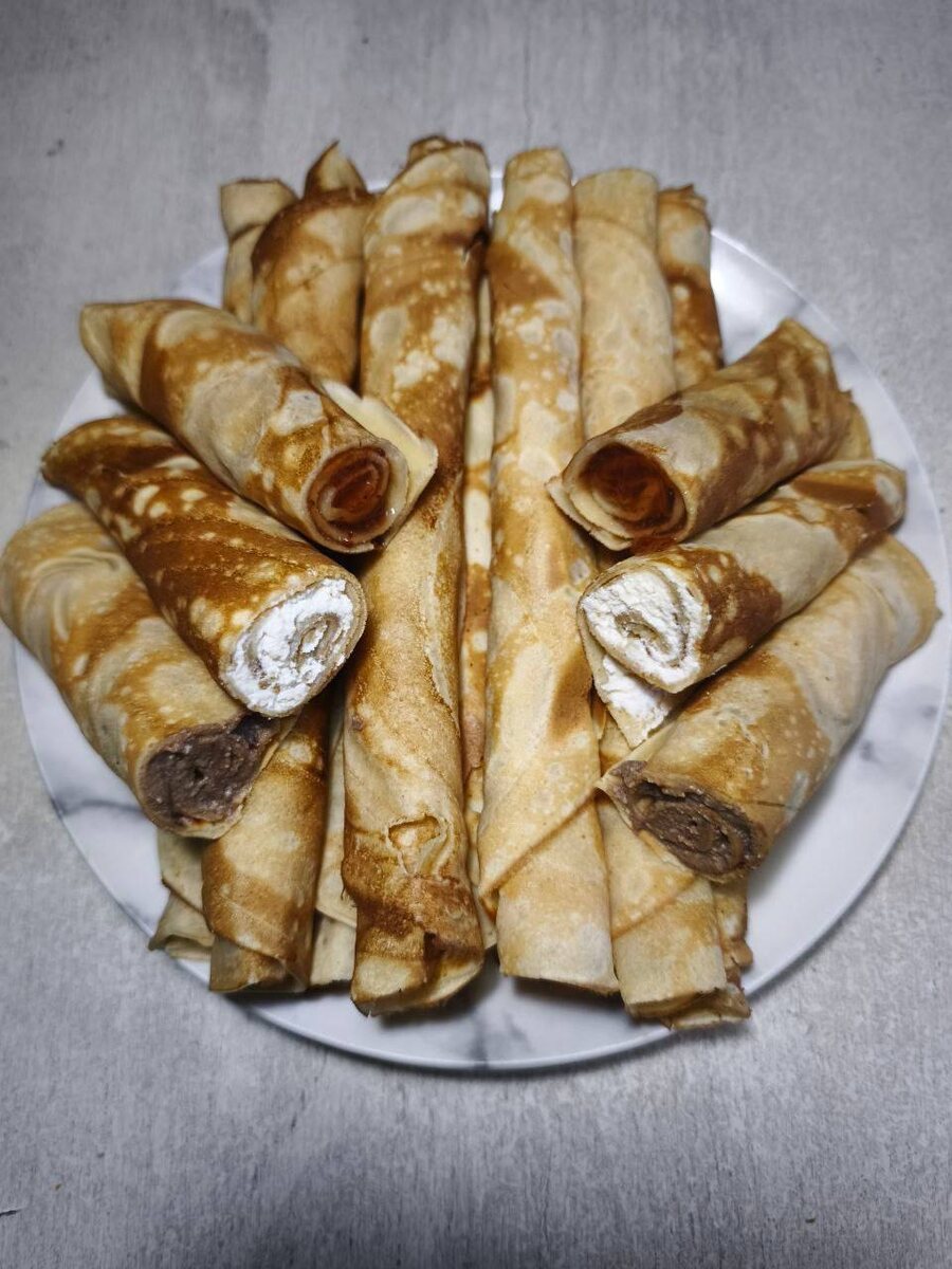 ☺️ 🥞 БЛИНЫ-ТРУБОЧКИ С НАЧИНКОЙ 📋 ИНГРЕДИЕНТЫ: Для теста: - 🥚 Яйца — 3 шт. - 🍚 Сахар — 100 г - 🥛 Молоко — 150 мл - 🧈 Масло сливочное или маргарин — 100 г - ✨ Ванилин — щепотка - 🌾 Мука пшеничная — 200 г Для начинки (на выбор): - 🍯 Варёная сгущёнка - 🍓 Варенье/джем - 🧀 Мягкий сыр (творожный, маскарпоне) 👩🍳 ПРИГОТОВЛЕНИЕ: 1️⃣ Готовим тесто: - Яйца взбить с сахаром до пышной пены (миксером 3-5 минут) - Растопить масло/маргарин, дать немного остыть - Добавить в яичную смесь молоко и растопленное масло - Всыпать ванилин - Постепенно ввести муку, перемешивая до однородности - Должно получиться вязкое тесто (гуще, чем на обычные блины) 2️⃣ Выпекаем блины: - Разогреть сухую сковороду на среднем огне - Выложить ~50 г теста, быстро распределить тонким слоем по всей поверхности - Жарить до золотистого цвета с одной стороны - Перевернуть, дожарить вторую сторону 3️⃣ Формируем трубочки: - Снять блин со сковороды - Сразу, пока горячий, свернуть в трубочку (можно вокруг деревянной