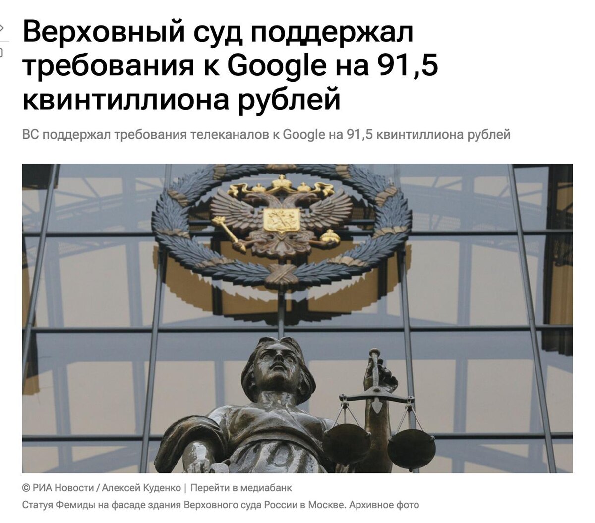 Верховный суд не стал пересматривать решения нижестоящих инстанций, которые признали требования российских телеканалов к ООО «Гугл» на сумму