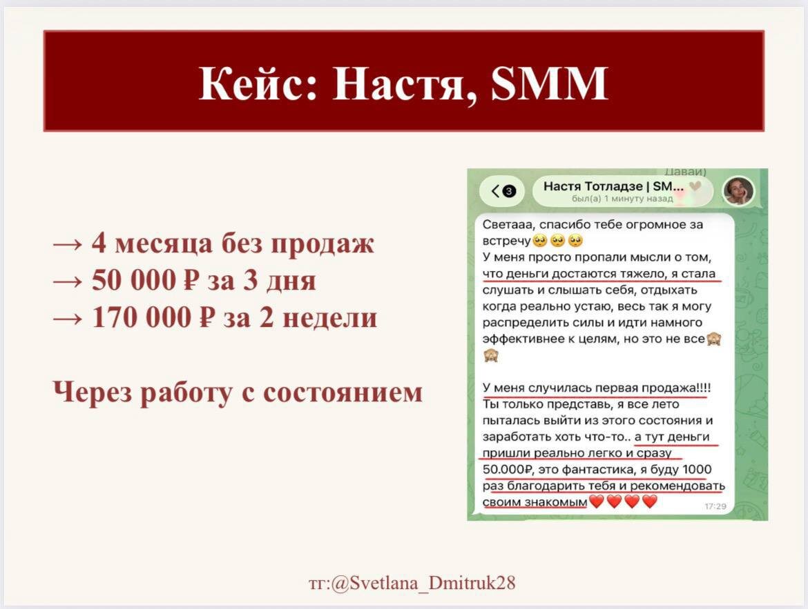 Хочу рассказать вам про одну девушку - ее зовут Настя. Она пришла ко мне с очень знакомым состоянием: «Я знаю, умею, могу. Но продаж нет». С июня месяца - тишина. Опыт, кейсы, желание есть. А денег и продаж - нет. Когда мы начали разбирать глубже, всплыло одно убеждение: «Деньги достаются тяжёлым трудом». И вроде бы банально. Но это убеждение жило с ней с детства. Внутри было ощущение, что если деньги приходят легко - значит это ненадолго. Или за это придётся «платить». Мы нашли, где это началось. Аккуратно разобрали. Прожили по-другому. И знаете, что изменилось первым? Не продажи, а СОСТОЯНИЕ! Она перестала суетиться. Перестала продавать из «мне срочно надо заработать денег». Появилась внутренняя устойчивость. И через несколько дней - первая продажа. 50 000₽. А за 14 дней доход вырос до 170 000₽. Но самое важное - она перестала жить в напряжении. Вот что делает внутренняя программа. И вот что меняется, если её убрать. Именно это мы будем делать на Практикуме про деньги.