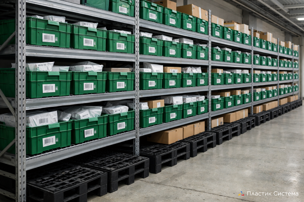 ➡️ Вечером - пик, когда люди идут за посылками после работы. Если пространство организовано «как получится», начинаются знакомые симптомы: Хорошая новость - проблема почти всегда не в людях. Она в системе хранения. Первое, что стоит пересобрать в ПВЗ - это зона разгрузки. Паллеты из пластика работают как буфер безопасности: В отличие от дерева, пластик не крошится, не боится влажной уборки и спокойно выдерживает ежедневную нагрузку. И самое важное - это сразу создаёт визуальный порядок. Когда пол свободен, помещение «дышит». Вторая ошибка ПВЗ - десятки разных коробок на стеллажах. Разный формат = разная высота = перекосы = потеря времени. Лучше всего работает единый тип ящика. Например, евроформат 600×400 мм — он плотно заходит на полку, не «гуляет» и позволяет гибко менять конфигурацию хранения. Плюсы одного формата: Гладкие пластиковые ст