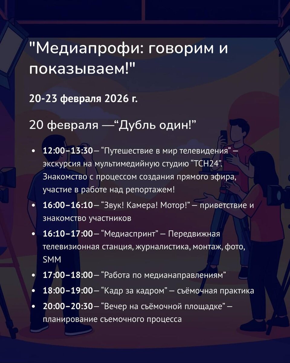 ! Делимся с вами долгожданным календарным планом медиасмены «Медиапрофи: говорим и показываем». 📹📝 🗓20 февраля —“Дубль один!” ❗12:00–13:30 — “Путешествие в мир телевидения” — экскурсия на мультимедийную студию “ТСН24”. Знакомство с процессом создания прямого эфира, участие в работе над репортажем! ❗16:00–16:10 — “Медиаспринт” — Передвижная телевизионная станция, журналистика, монтаж, фото, SMM ❗16:10–17:00 — “Медиаспринт” — Передвижная телевизионная станция , журналистика, монтаж ❗17:00–18:00 — “Работа по медианаправлениям” ❗18:00–19:00 — “Кадр за кадром” — съёмочная практика ❗20:00–20:30 — “Вечер на съёмочной площадке” — планирование съемочного процесса 🗓21 февраля — “Дубль два!” ❗10:00–13:00 — “Утро на съёмочной площадке” — планирование, работа по направлениям, съемки ❗17:00–18:00 — “Подключаем камеры” — Подготовка к прямому эфиру ❗18:00–19:00 — “Live: разговор без дублей” — прямой эфир с гостем ❗20:30–22:00 — “На связи медиапрофи” — прямой эфир концерта 🗓22 февраля — “Дубль