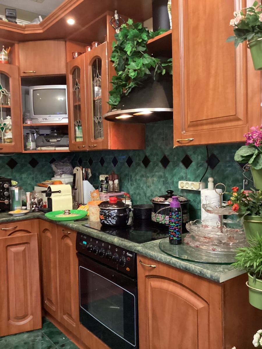 Зеленая столешница под мрамор, фасады с патиной в стиле "Прованс", витражи - когда-то очень дорогие решения, от которых уже просто дергается
