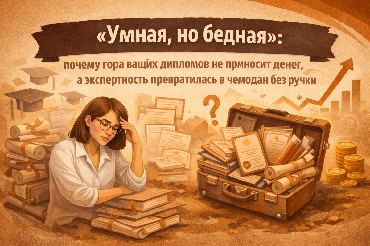 Я перевожу взгляд на свои дипломы. Психология, коучинг, банковское прошлое с его жесткой дисциплиной, сертификаты по нейросетям, кейсы X10… У меня знаний на три библиотеки, а заявок в директе - как снега в Сахаре. Внутри поднимается волна раздражения, переходящая в глухую обиду. Я чувствую себя как человек, который собрал по деталям мощный двигатель от «Феррари», но пытается завести его, привязав к нему весла.
