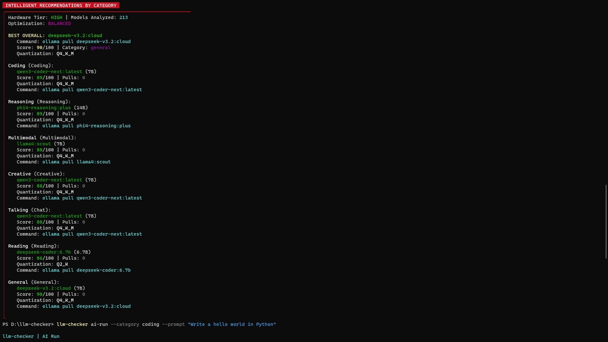Нашел интересную программу, думаю кому то будет полезно, анализирует ваше железо и находит оптимальную ллмку Анализирует ваши (GPU, CPU, RAM). Оценивает 200+ моделей по 4 критериям: качество, скорость, совместимость, контекст Выдаёт готовые команды для установки лучших моделей, интегрируется с Claude через MCP Пошаговая инструкция (просто в cmd вставляем) 1) Установка npm install -g llm-checker 2) Определение железа llm-checker hw-detect 3) Рекомендации по категориям llm-checker recommend --category coding 4) Автоматический запуск модели llm-checker ai-run --category coding --prompt "Write a hello world in Python" Если хотите воспользоваться и автоматическим запуском модели нужно будет скачать ollama, в любом случае при возникновении ошибок каких то, или если не будет каких то компонентов вам дадут команды для установок и фикса GitHub npm Package Документация