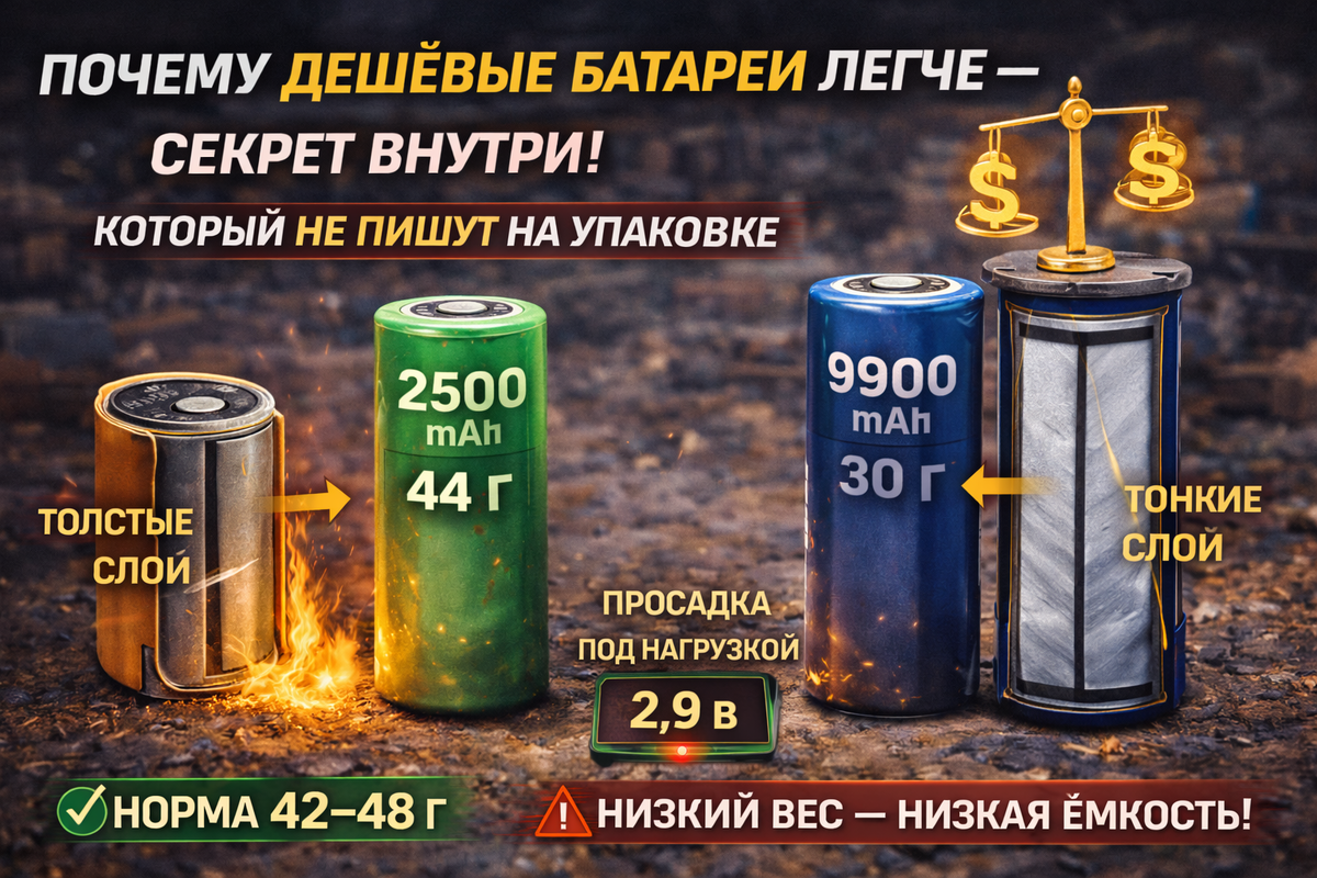 Одна тяжёлая, вторая подозрительно лёгкая. Новички радуются: «О, легче — значит лучше». Я такие вскрывал. И секрет там не в новых технологиях. Вес аккумулятора — это не случайность. Внутри не воздух, а активный материал. И если батарея заметно легче — значит чего-то там меньше. Разберёмся, чего именно. Внутри Li-ion или 18650: Чем больше активного материала — тем выше ёмкость. А активный материал — это вес. Меньше веса → меньше химии → меньше ёмкости. Физику обмануть сложно. Если на банке написано 5000–9900 мАч,