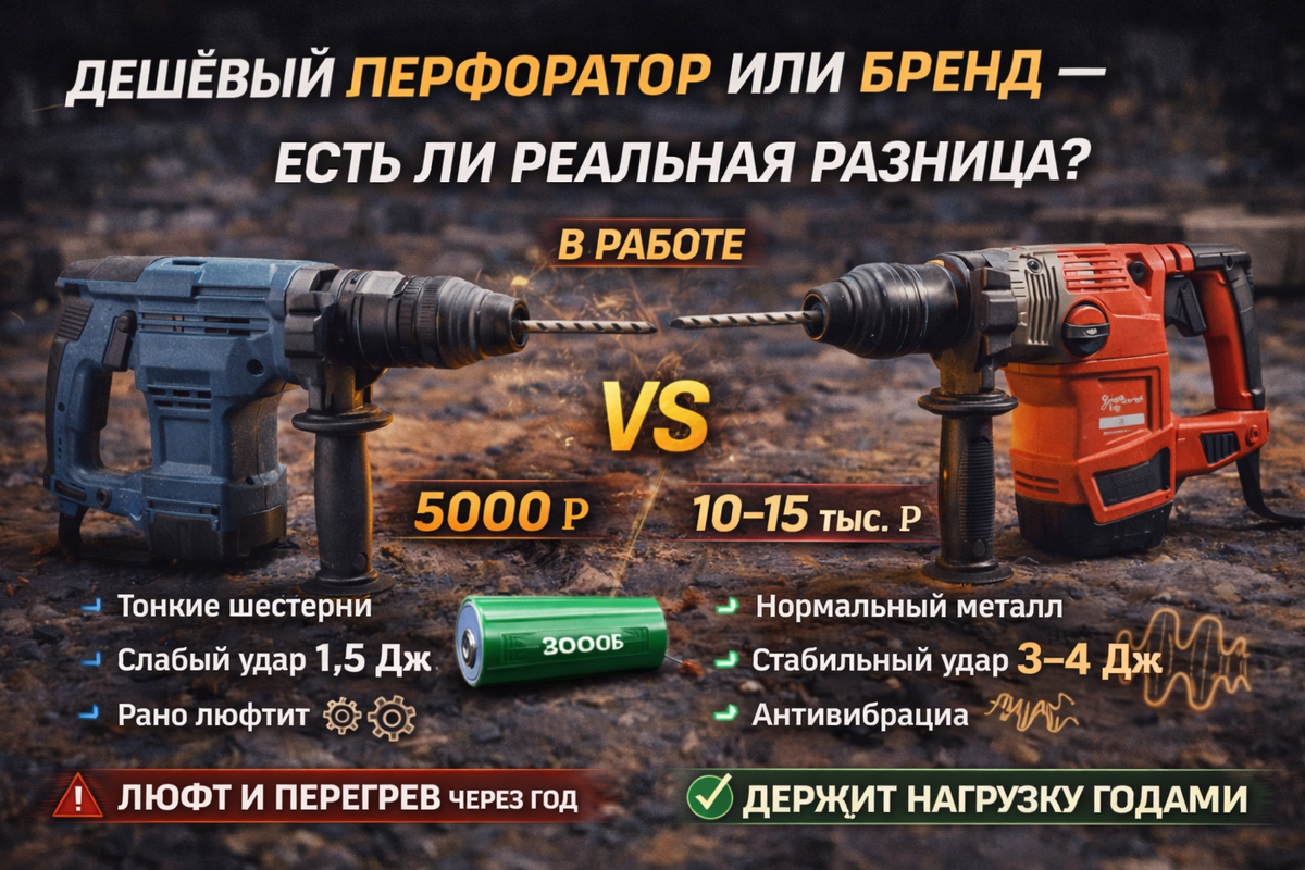 Если штробить бетон — совсем другое. Разберём по-честному. Перфоратор работает так: Мотор → редуктор → поршень → воздушная подушка → боёк → удар по буре. Сила удара измеряется в джоулях. Чем стабильнее механизм и металл внутри — тем дольше живёт инструмент. 900 Вт не равно 900 Вт. У дешёвых инструментов мощность часто «маркетинговая». Главное — сила удара (Дж) и стабильность под нагрузкой. В дешёвых моделях: Через год активной работы начинается люфт. Купили лёгкий перфоратор и штробят им по 3 часа подряд. Он не для этого. По привычке: Как делаю я: Я видел дешёвый перфоратор, который умер после 200–300 отверстий в бетоне. Бренд при той