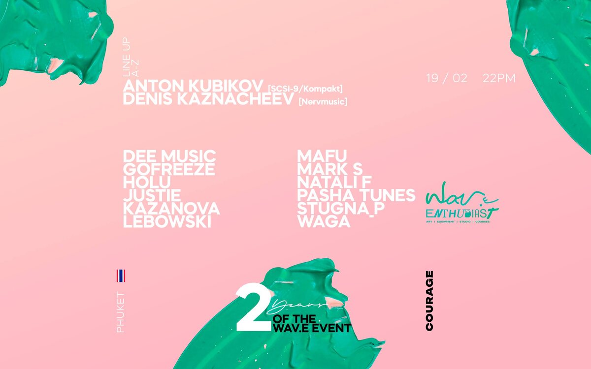 19 февраля, Courage Bar, Пхукет WAV.e отмечает 2 года и проводит вечеринки в эти выходные на Пхукете вместе с командой Enthusiast и в Москве в баре Край. Хедлайнеры: Anton Kubikov (SCSI-9 / Kompakt) — один из ключевых артистов минимал-сцены, известный своим глубоким, точным звучанием и многолетним опытом выступлений по всему миру. Denis Kaznacheev — сооснователь Nervmusic, мастер гипнотического минимала и атмосферных, постепенно раскрывающихся сетов. Line-up: Anton Kubikov Denis Kaznacheev Mark S Natali F Mafu Gofreeze Pasha Tunes Dee music Holu Stugna_p Justie Lebowski Kazanova Waga 🎫 Билеты — 300 THB DOOR — 400 THB 📆 19 февраля, в 21:00 📍 Courage Bar, Phuket, Thailand