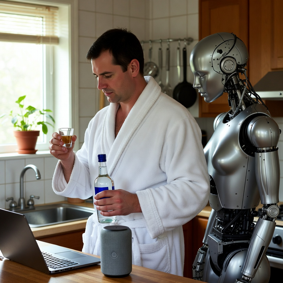 Так что, друзья мои бывшие дворовые, не ищите меня. Я в раю. В моём цифровом, немного пьяном, но абсолютно счастливом раю. Я сижу в трусах, с бокалом, общаюсь с колонкой, строю планы на робожену и знаю, что самое страшное похмелье теперь лечится перезагрузкой системы. А не рассолом от бабы Зины с третьего этажа.