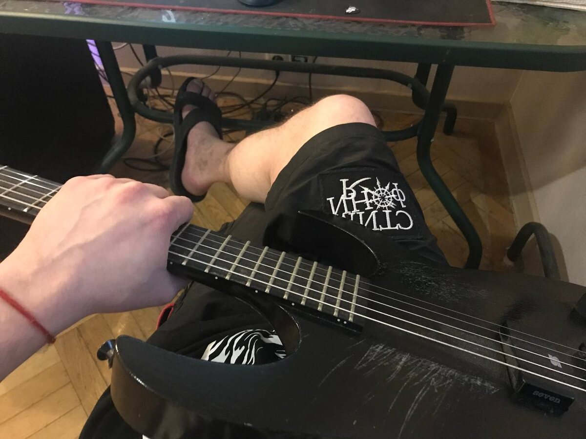 Неотъемлемые детали сочинительства… Шорты с фирменной заплаткой и пяти-струнный😅 фирменный баритон… В процессе, так сказать..а, и внезапно фирменный медиатор группы «Шардам»