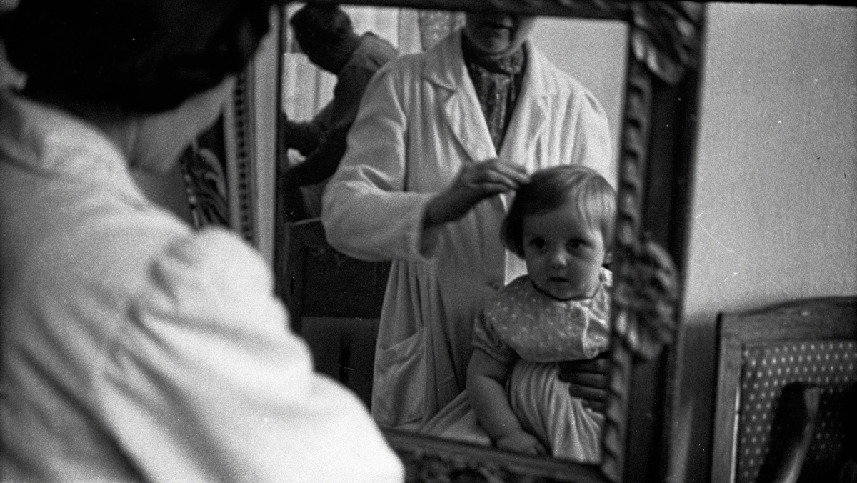 Черно-белый снимок, зеркало в деревянной раме, и в нем - малыш, который смотрит прямо на нас. Серьезно, почти настороженно. Мастер в белом халате что-то поправляет на макушке, а ребенок явно не понимает, что происходит, но держится. Это первая стрижка - один из тех моментов, которые родители помнят всю жизнь, а дети забывают. Парикмахер в таком кадре невольно становится частью семейной истории.