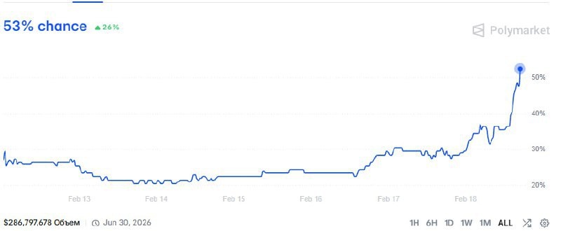 Шанс того, что США нанесут удар по Ирану до 15 марта, на рынке прогнозов Polymarket вырос до 53% против около 30% ещё вчера. 🗂 Polymarket — это децентрализованный рынок прогнозов, где участники делают ставки на политические и экономические события, а цена контрактов отражает ожидания рынка в реальном времени. 👨💻 Рост связан с усилением напряжённости. Axios сообщает, что США и союзники приближаются к военному сценарию против Ирана, возможна операция совместно с Израилем. Глава Минэнерго США Крис Райт заявил о намерении остановить ядерную программу Тегерана «любыми способами». Также фиксируется переброска самолётов-заправщиков, транспортной авиации и ДРЛО на Ближний Восток. Готовы к волатильности?