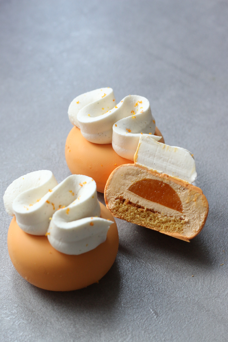 Щепотка соли Соединить в сотейнике масло, мед. Довести до кипения и всыпать соду. Выключить огонь. Остудить немного. Взбить яйца с сахаром в пышную пену. Добавить к ним медовую массу, объединить венчиком, всыпать муку, соль и замешать тесто. Вылить на пергамент и отпекать 8-9 минут при 175°С до золотистой корочки. Остудить, обрезать по размеру формы (в данном случае d=5см). Конфи «Морошка-Мандарин»: Пюре AGROBAR Морошка – 150г