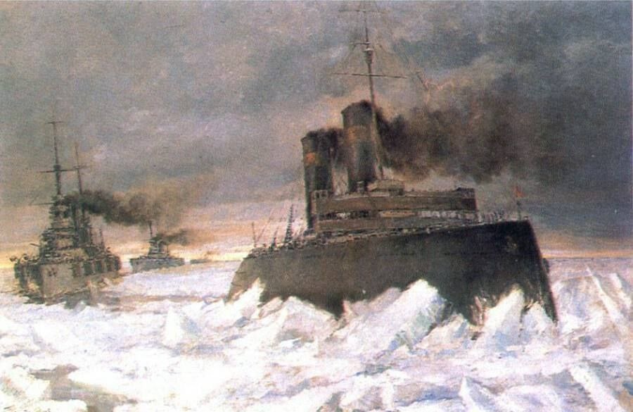 🔸Ледовый поход Балтийского флота — это уникальная стратегическая операция периода Первой мировой войны, целью которой был вывод российских кораблей из Ревеля (Таллина) и Гельсингфорса (Хельсинки) в Кронштадт для спасения от захвата наступающими германскими и финскими войсками. 🔸Угроза захвата основных сил флота, сосредоточенных в Ревеле, заставила командование начать срочную эвакуацию. 19 февраля 1918 года, под прикрытием ледоколов, корабли покинули порт. К моменту вступления немцев в Ревель 25 февраля большая часть эскадры уже вышла на открытую воду. 🔸После срыва Брест-Литовских мирных переговоров Германия возобновила наступление в Прибалтике, а гражданская война в Финляндии сделала небезопасной стоянку в Гельсингфорсе. Поэтому, прибыв туда 5 марта, флот после короткой остановки 12 марта вновь двинулся в путь, сопровождаемый ледоколами. 🔸Операция, которой руководил начальник Морских сил Балтийского моря Алексей Щастный, проходила в исключительно тяжёлых условиях. Преодолев 330