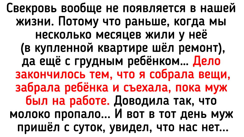 Потому что раньше, когда мы несколько месяцев жили у неё (в купленной квартире шёл ремонт), да ещё с грудным ребёнком… дело закончилось тем, что я собрала вещи, забрала ребёнка и съехала, пока муж был на работе.