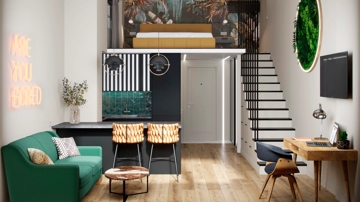 Обычно высокие потолки встречаются в просторном жилье, но эта история — про ремонт в апартаментах размером всего 30 кв. м. Рассказала её дизайнер Ксения Моспан, основательница K-buro и преподаватель Британской высшей школы дизайна. Ксения воспользовалась высотой потолков, чтобы оборудовать в квартире второй уровень — ради приватной спальни и удобного места хранения под лестницей.