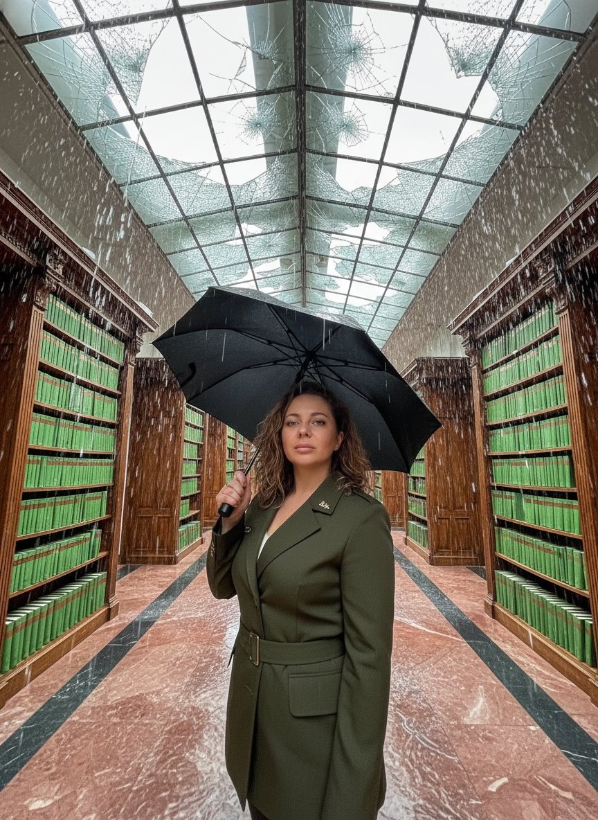 🎨 Промпт: Портрет женщины из референсного фото, ее черты лица и облик неизменны. Она стоит в величественной викторианской библиотеке, но потолок из стеклянных панелей разбит, и сквозь него внутрь льется настоящий дождь. Женщина уверенно смотрит прямо в камеру, высоко подняв в руке черный зонт, защищающий ее от струй воды. На ней стильный военный жакет темно-зеленого цвета. По книжным полкам стекают ручейки, а на мраморном полу образуются лужи. Яркое, воздушное, высококонтрастное освещение пасмурного дня. Фотография сделана на широкоугольный объектив 24mm, с необычного низкого ракурса, чтобы захватить масштаб помещения и дождь. В кадре — насыщенные цвета: весенняя зелень книжных переплетов и нежные розовые оттенки мрамора. Сюрреалистичная, творческая композиция, атмосфера силы и уверенности. Банк Промптов | Твои Идеи