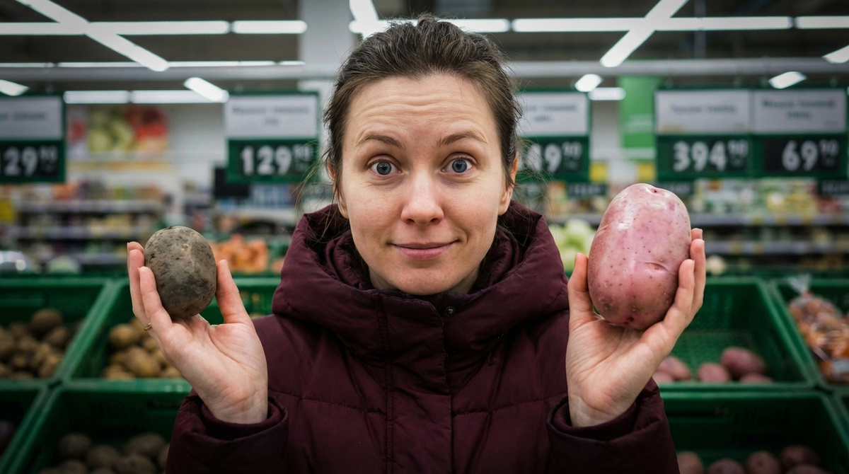 Морозным зимним утром покупательница разглядывает картошку в сетевом супермаркете: клубни порезанные, с вмятинами, будто их специально отбирали по принципу "всё самое страшное — в розницу". Ценник при этом кусается — под 90 рублей за килограмм. Рядом лежит египетская, чистенькая, ровная, но ещё дороже. Женщина вздыхает, берет отечественную и бормочет себе под нос: "Где та картошка, что с огорода у бабушки осенью была?"