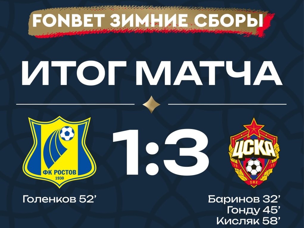 Это первое поражение донского футбольного клуба на проходящих в Абу-Даби (ОАЭ) зимних сборах. В этом году ростовчане на сборах отличились и успели всё: так, например, недавно подрались с соперниками из Китая. Китайцы обиделись и ушли с поля, игру отменили. Но стыд остался. До этого ФК “Ростов” обыграл ещё один китайский клуб. А впервой встрече 17 января наши разгромили китайцев со счётом 3:0. 14 января играли с «Локо» - и Николай Комличенко лишил ростовчан победы. 1 февраля ростовчане не смогли одолеть «Родину». Ну, а 4 февраля ростовчане разгромили ереванский клуб на зимних сборах. Сегодня играли с ЦСКА. Надежды, конечно, не было никакой, но вдруг... Вдруг - не случилось. Лишь один мяч смог отыграть у москвичей Егор Голенков. Счёт игры - 1:3. В общем, ждём команду дома - уже вот-вот продолжится сезон РПЛ и Кубок России. Иллюстрация из тг-канала ФК "Ростов"