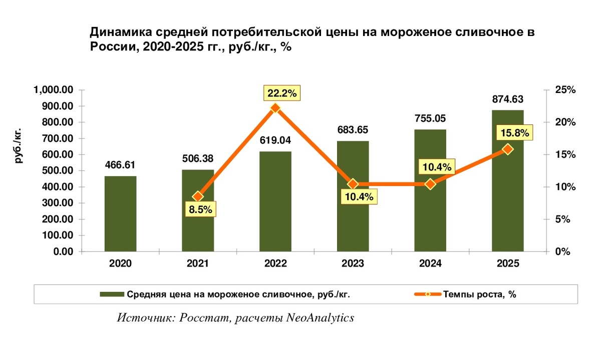 В ходе ежемесячного мониторинга розничных (потребительских) цен за 1 кг. мороженого сливочного, проведенного NeoAnalytics, выяснилось, за последние шесть лет средняя цена в рознице выросла в два раза. Еще в 2020 г. один кг. мороженого сливочного можно было купить в среднем за 467 руб., а в 2025 г. – уже за 875 руб. за кг. Объектом исследования являются средние цены на мороженое сливочное или сливочное с добавлением растительных жиров, с различными наполнителями, с вафлями или в шоколадной глазури типа крем-брюле, пломбир и т.п. Кроме пирожных и тортов из мороженого. Индексация существенно усилилась в 2022 г., когда взлетели цены на многие продовольственные и непродовольственные товары в России и мороженое сливочное не стало исключением. В последующие годы динамика роста была не такой интенсивной и средний прирост в период 2023-2025 гг. составил на уровне 12,2%. В марте 2022 г. произошел резкий рост средних цен на мороженое. Каждый последующий год начинался с очередной индексации и в р
