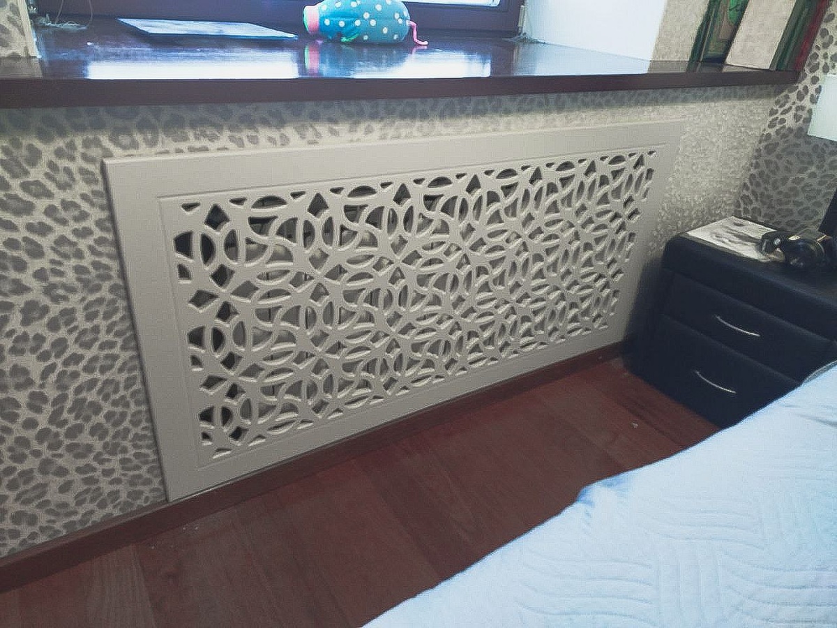 Экран для радиатора отопления из МДФ с фрезерованным узором. Изготовлен по индивидуальным размерам, с точной подгонкой под проём.