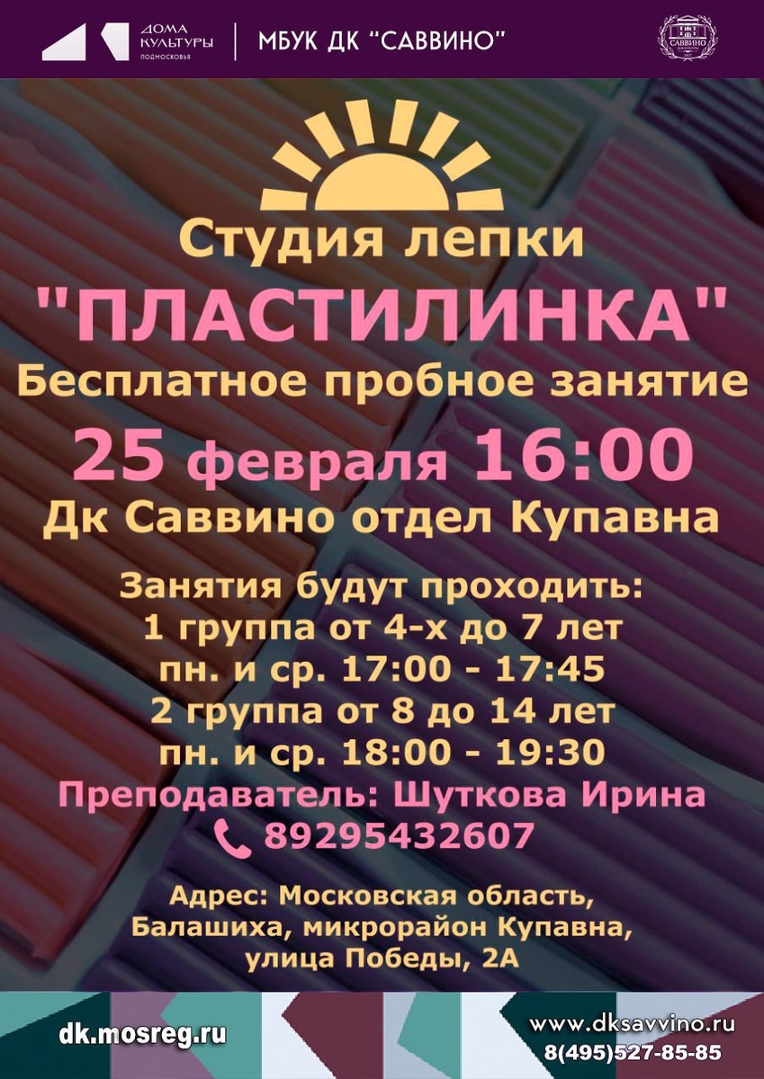 ! 🌟 В ДК «Саввино» (отдел Купавна) открывается студия лепки «Пластилинка»! 🎨 Приглашаем ребят от 4 лет присоединиться к увлекательным занятиям, где они смогут создавать яркие поделки, развивать мелкую моторику и раскрывать творческий потенциал. ✨ Специальное событие: 25 февраля в 16:00 пройдёт бесплатное пробное занятие — приходите, пробуйте, вдохновляйтесь! Почему стоит выбрать «Пластилинку»: - занятия адаптированы для детей от 4 лет; - профессиональный педагог поможет освоить техники лепки; - творческая атмосфера и возможность создавать уникальные работы; - первое занятие — абсолютно бесплатно! Не упустите шанс открыть для своего ребёнка мир пластилинового искусства! 📞 Записаться на пробное занятие можно по телефону: 8 (929) 543-26-07 Ждём вас в студии «Пластилинка»! Подарите своему ребенку возможность творить и радоваться созиданию.