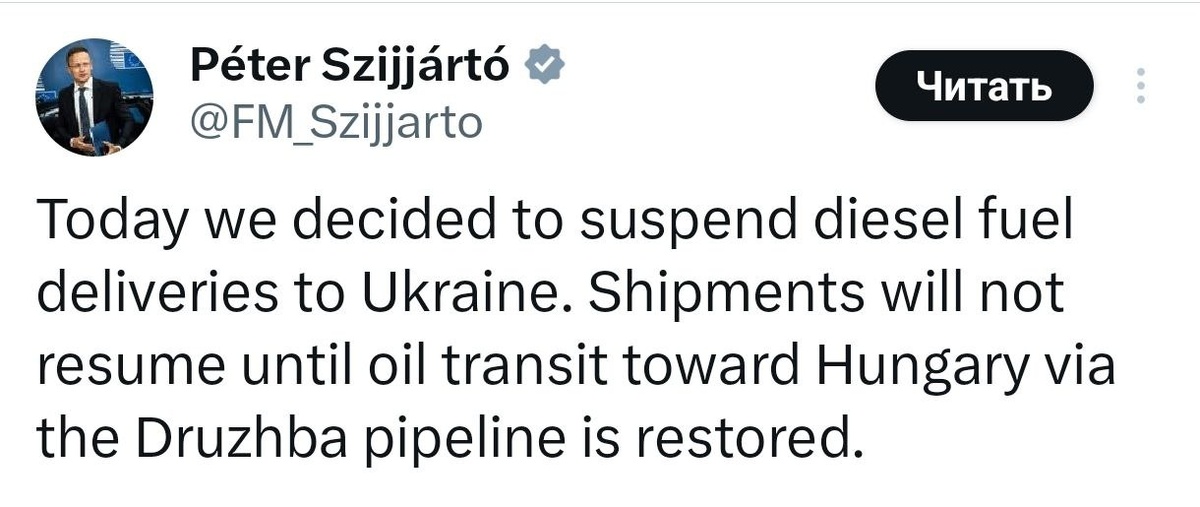Глава МИД Венгрии Петер Сийярто сообщил, что Венгрия приостанавливает поставку дизеля на Украину, в ответ на действия Зеленского
