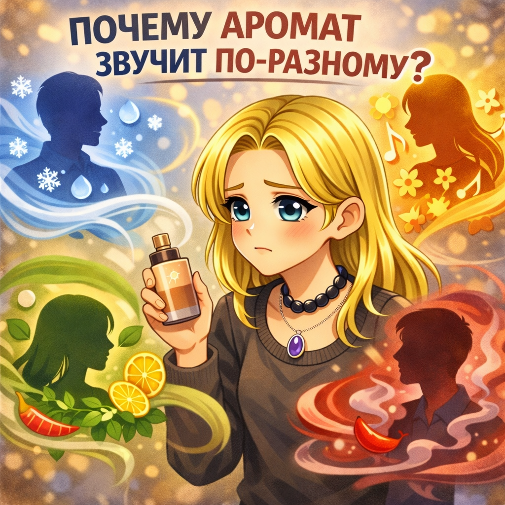Именно поэтому два человека могут нанести один и тот же аромат из одного флакона — и получить два разных впечатления: у кого-то больше цитрусов и свежести, у другого — больше сладости, древесности или даже «мыльности».