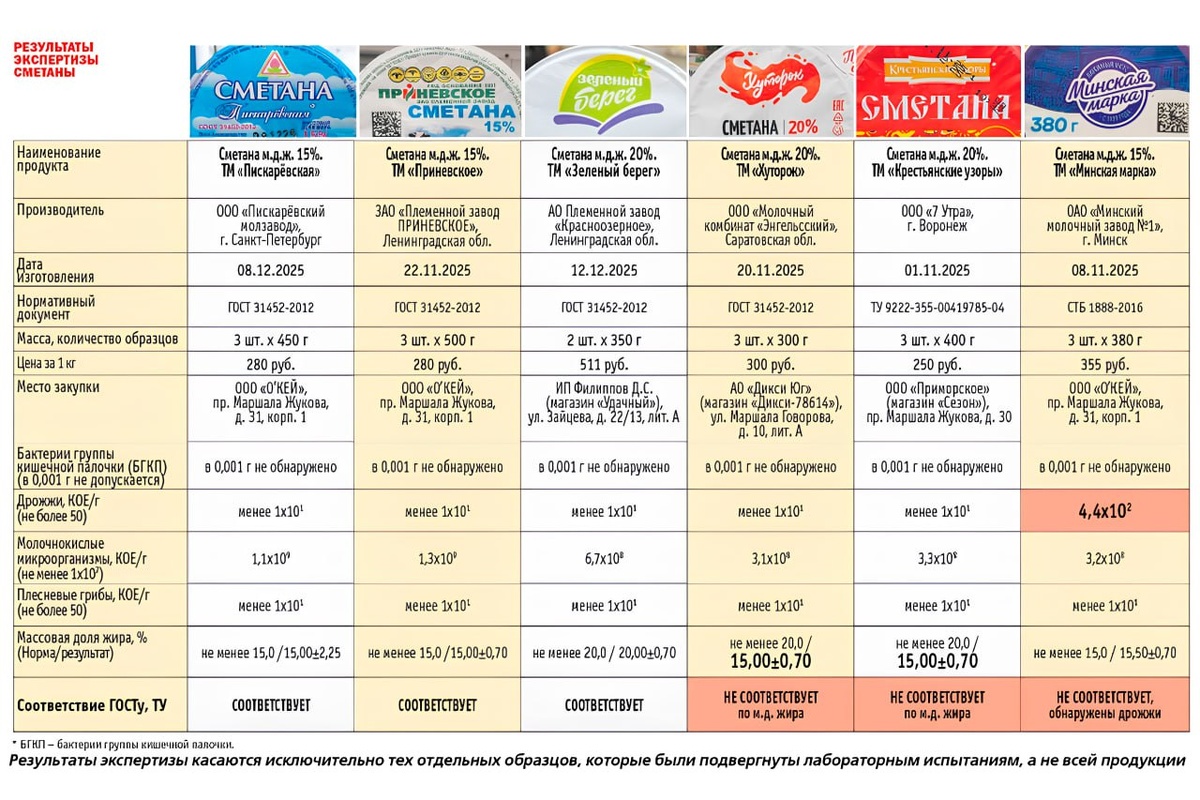 Из 12 образцов безопасны лишь три. В остальных нашли кишечную палочку, а дрожжи и плесень превышали норму в сотни раз. Производители также занижают жирность: вместо заявленных 15–30% там всего 10,5–19%. Чистыми прошли только «Пискаревская», «Приневское» и «Зеленый берег». 📷: «Общественный контроль» Читай нас в MAX! | Читай нас в Telegram